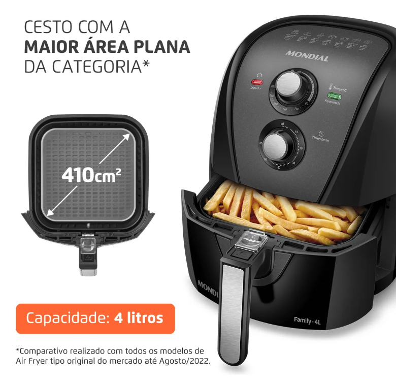 Com capacidade de 4,2 litros, ela consegue preparar refeições para famílias pequenas ou médias. O modelo possui controle de temperatura ajustável, timer com desligamento automático e cesto removível com revestimento antiaderente, que facilita a limpeza e evita que os alimentos grudem.