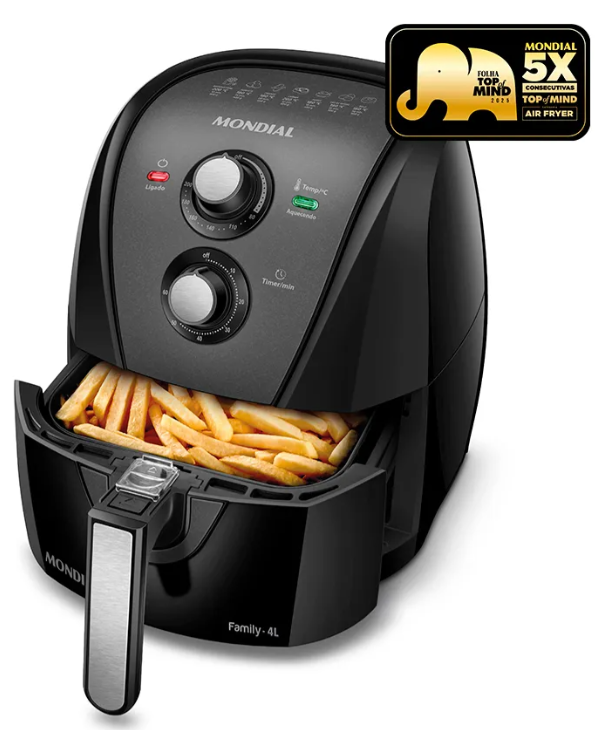 A Mondial Family AFN-40 é uma das air fryers mais vendidas do Brasil e se destaca pelo excelente custo-benefício aliado a uma boa capacidade para uso doméstico. Com 4 litros de capacidade, ela permite preparar porções generosas de alimentos como batatas fritas, frango, carnes, nuggets, legumes e até sobremesas sem a necessidade de utilizar óleo.